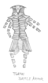 The Tlaroi are a race of sentient, omnivorous creatures superficially resembling large ants or termites. Their body is strongly segmented and they have three pairs of limbs. The lowest is a pair of strong legs, and the middle and upper ones are both used for manipulation. The lower arms are much stronger than the upper ones but less nimble. The head is wedge-shaped and sports powerful mandibles, two pairs of delicate antennae, and two multi-faceted eyes which are the Tlaroi's primary sensory organs.